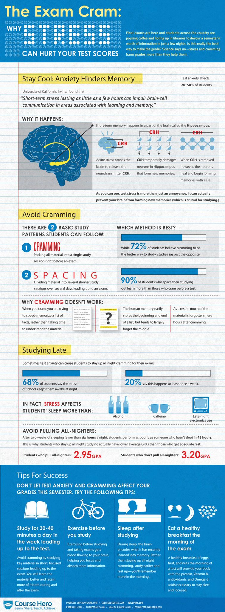 Dibanding cramming siswa dapat mempersiapkan diri lebih baik dengan cara spacing; yakni membagi materi pelajaran, untuk dipelajari dalam beberapa sesi. Dalam sebuah penelitian ditemukan bahwa, 90% siswa yang melakukan spacing belajar lebih banyak dibanding siswa yang melakukan cramming. Siswa dapat membagi sesi belajar dalam 'spacing' sekitar 30-40 menit per hari, dalam jangka waktu seminggu sebelum ujian dimulai.